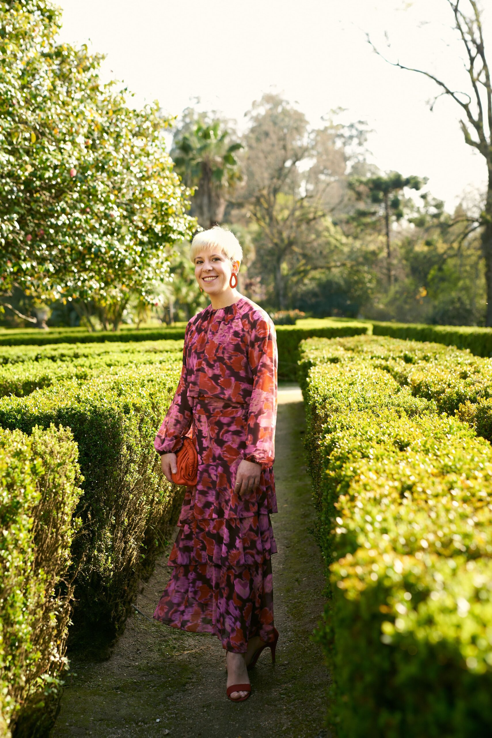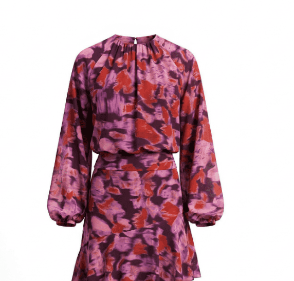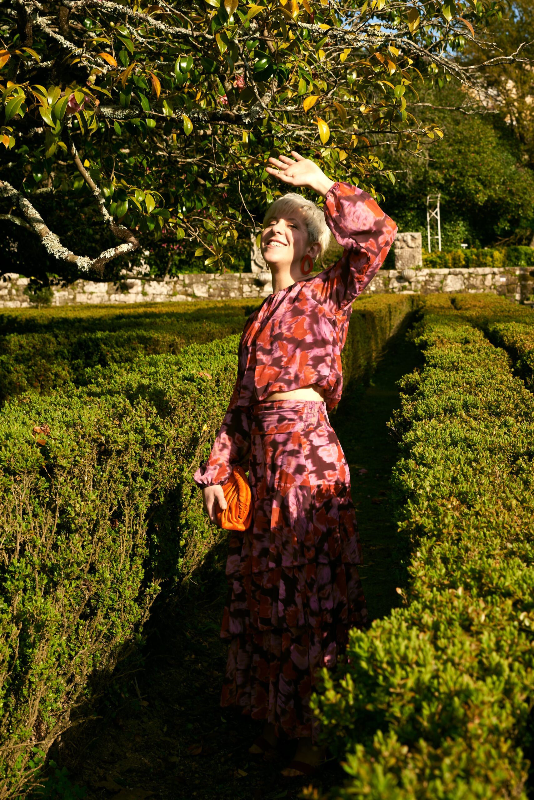 Blusa estampada en tonos rosas, naranjas y morados. Es crop.