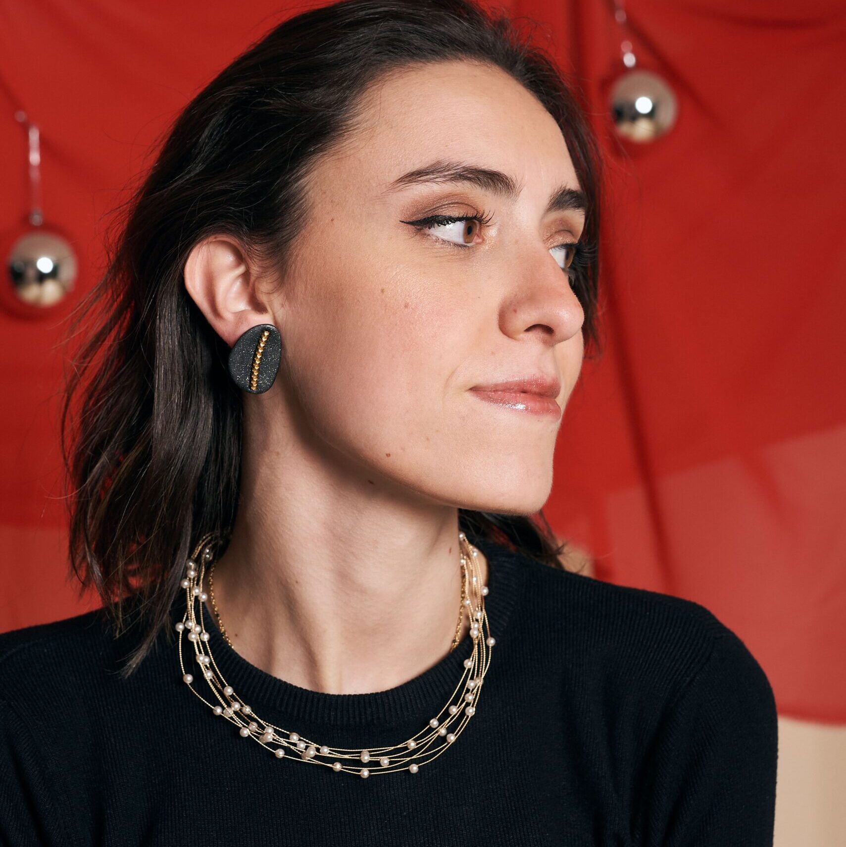 Pendientes de arcilla polimérica en color negro metalizado purpurina con pieza de acero inoxidable dorada