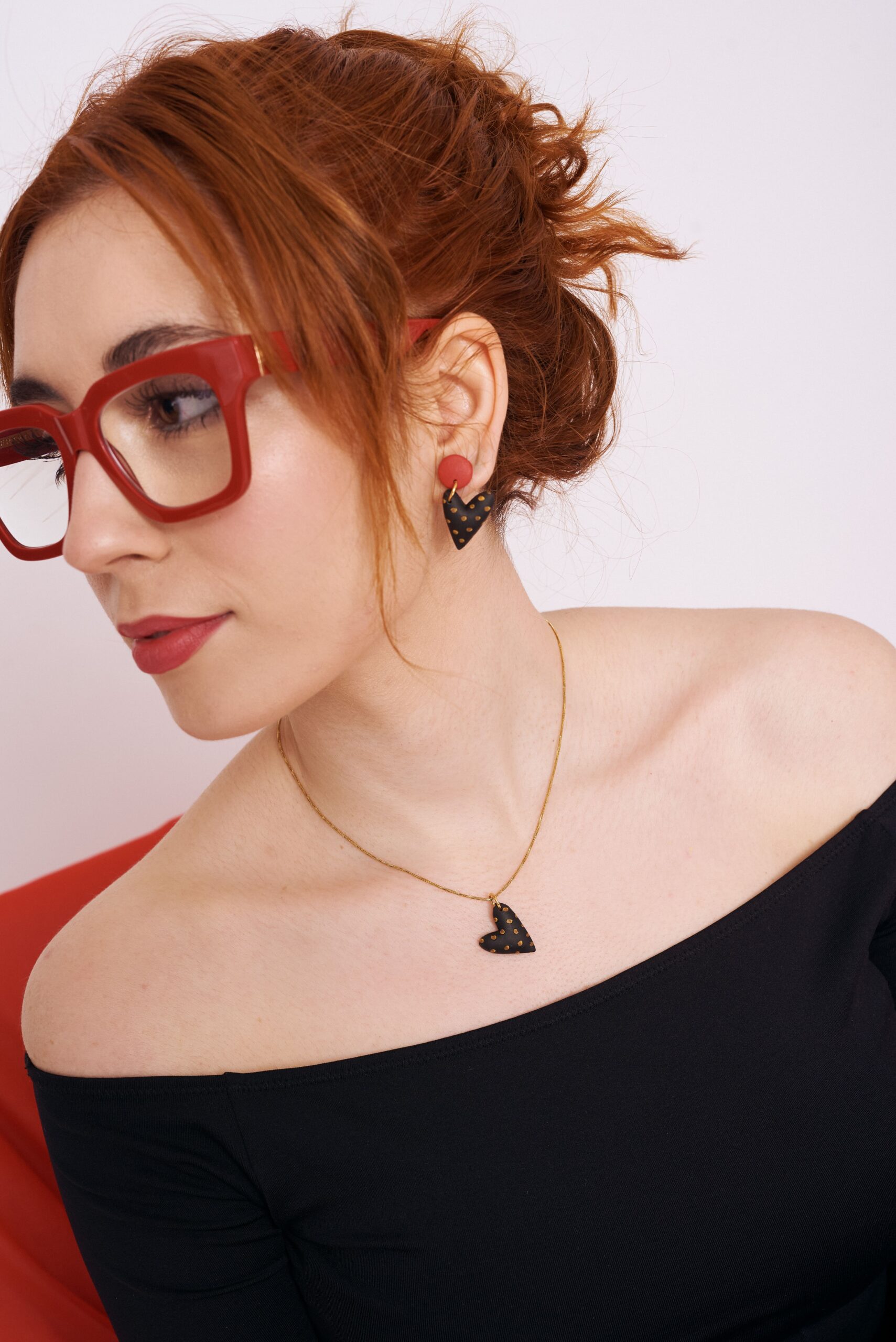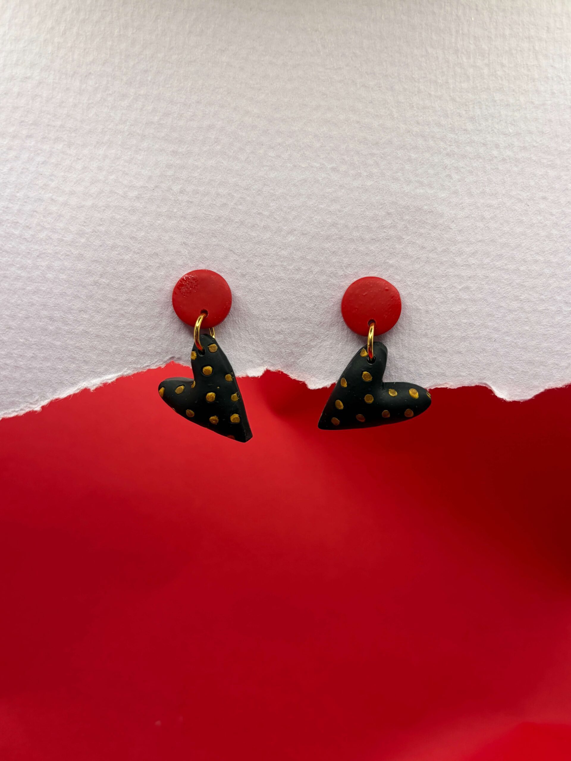 Pendiente de arcilla polimérica con estampado círculos en dorado hecho a mano uno a uno con la propia arcilla, perno trasero de acero quiúrgico.