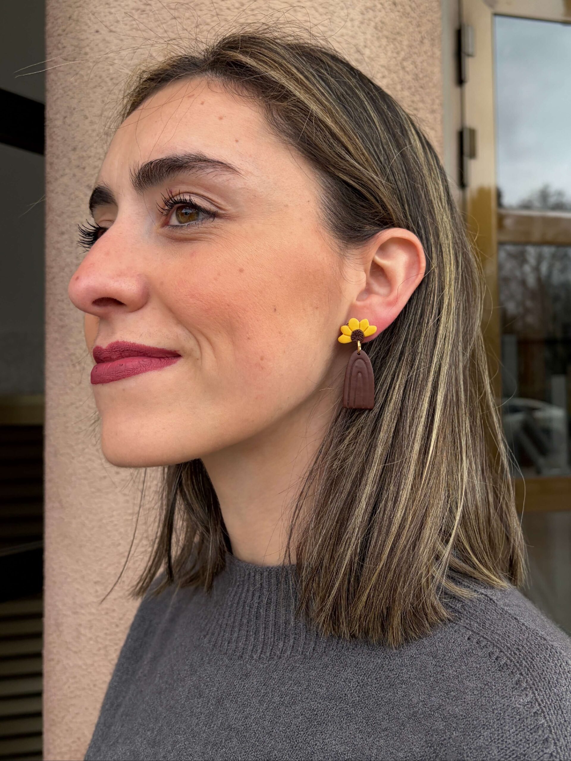 Pendiente combinando dos tonos de la temporada, chocolate y amarillo, inspirado en un girasol.