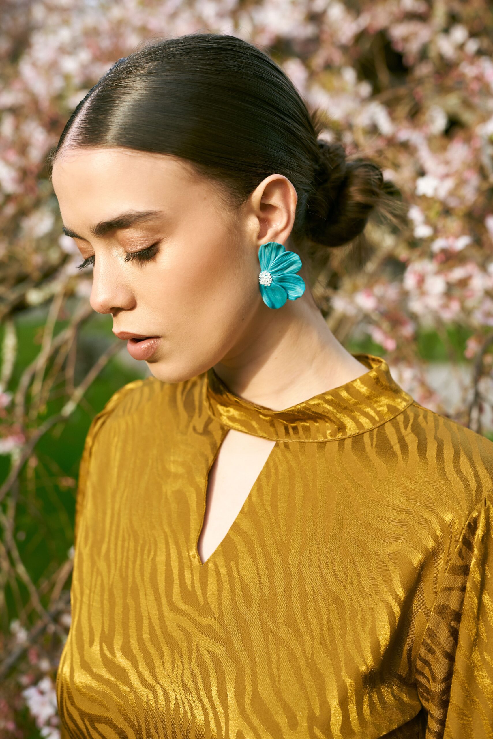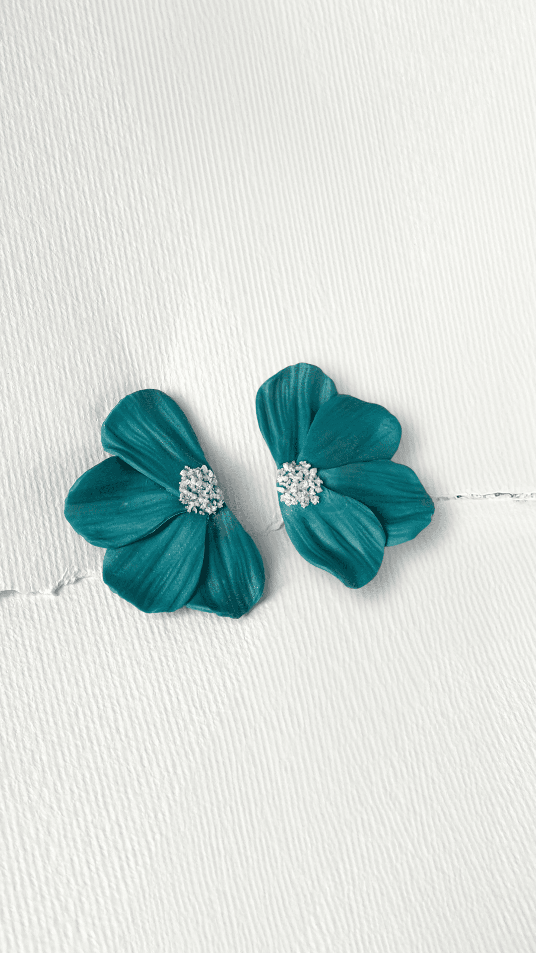 Pendientes media flor en color nácar con dorado en el centro. Formada por un total de 8 pétalos el par, hechos a mano uno a uno con arcilla polimérica. Material muy ligero, que no pesa.