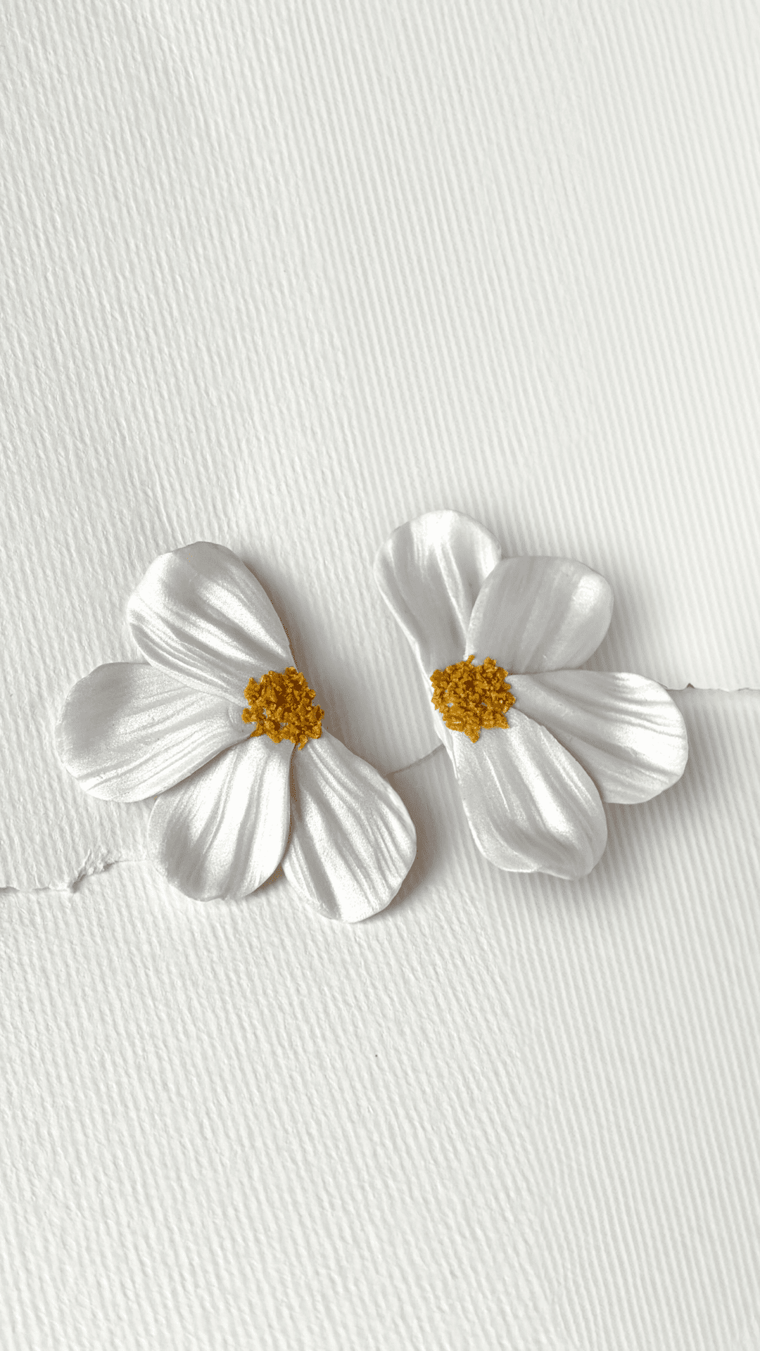 Pendientes media flor en color nácar con dorado en el centro. Formada por un total de 8 pétalos el par, hechos a mano uno a uno con arcilla polimérica. Material muy ligero, que no pesa.