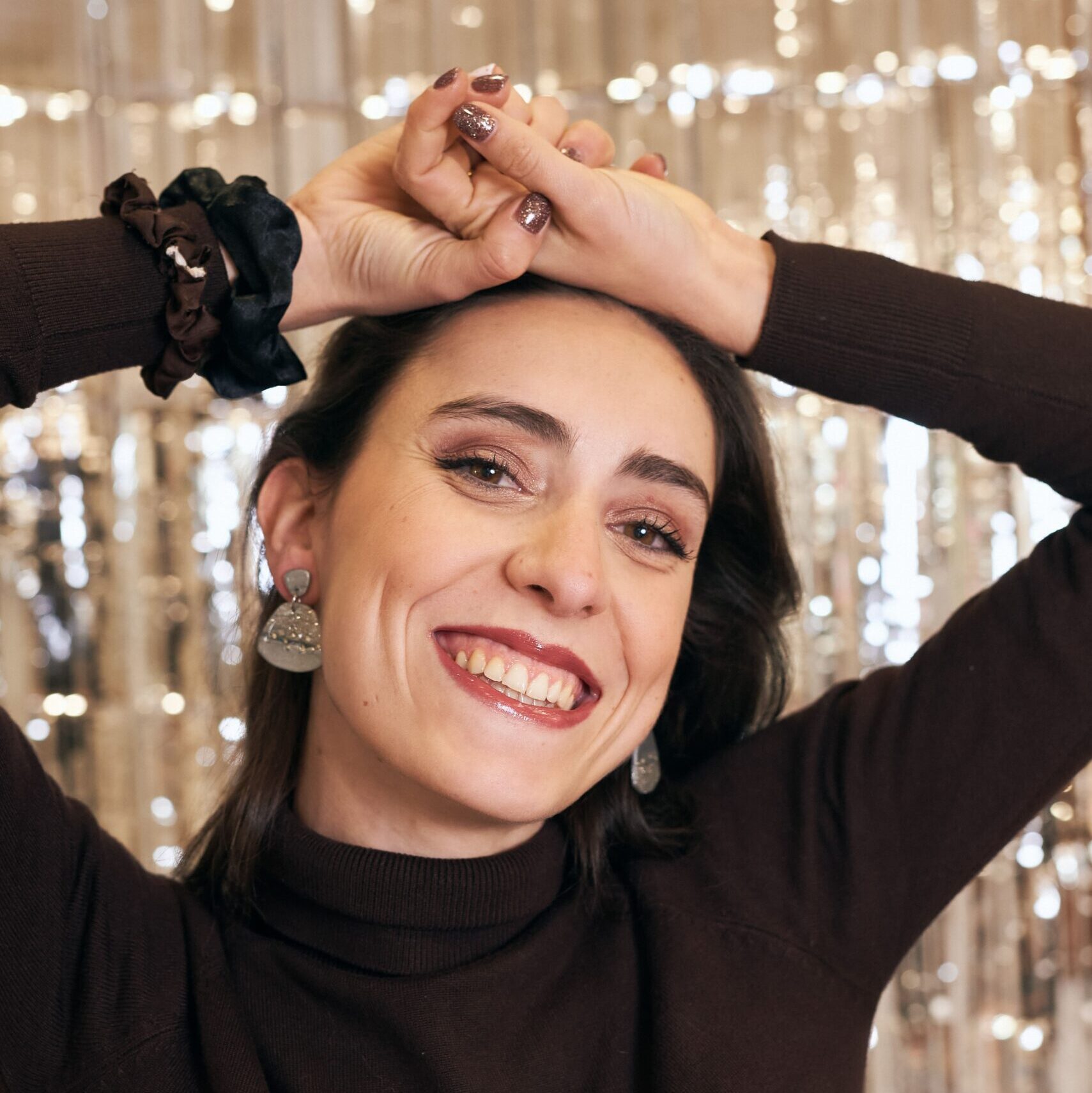 Pendiente en arcilla polimérica con purpurina dorada y mezcla en arcilla metalizada, con piedras y brillo por encima para potenciar los destellos. Es invertido cada lado para hacerlo todavía más especial.