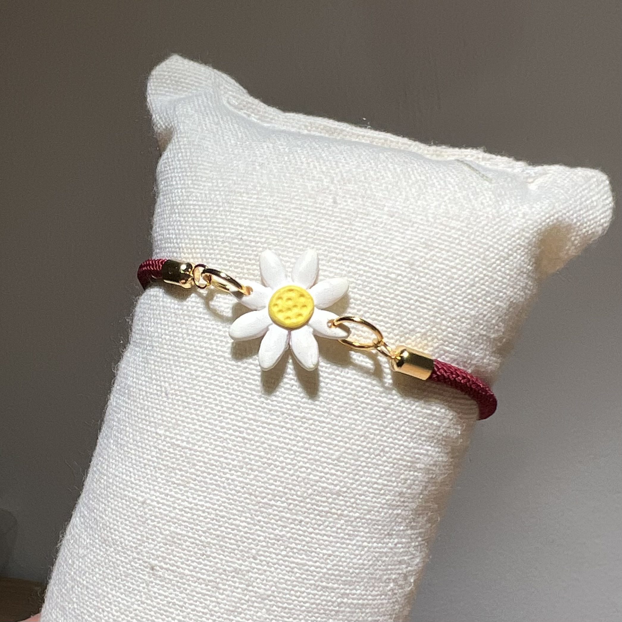 Pulsera ajustable con cordón a escoger el color. Terminaciones en acero inoxidable. Margarita hecha a mano con arcilla polimérica, si quieres otro diseño contacta!