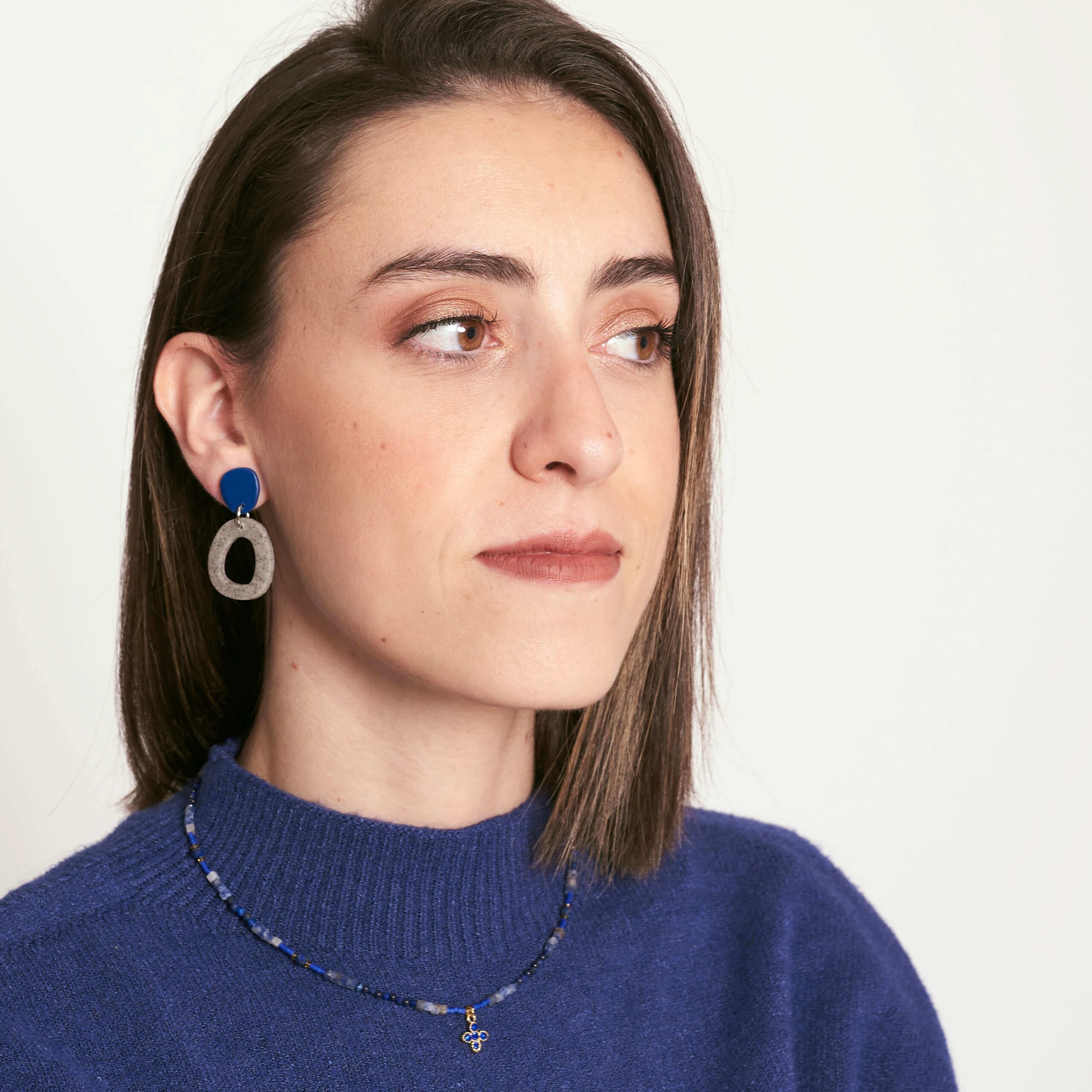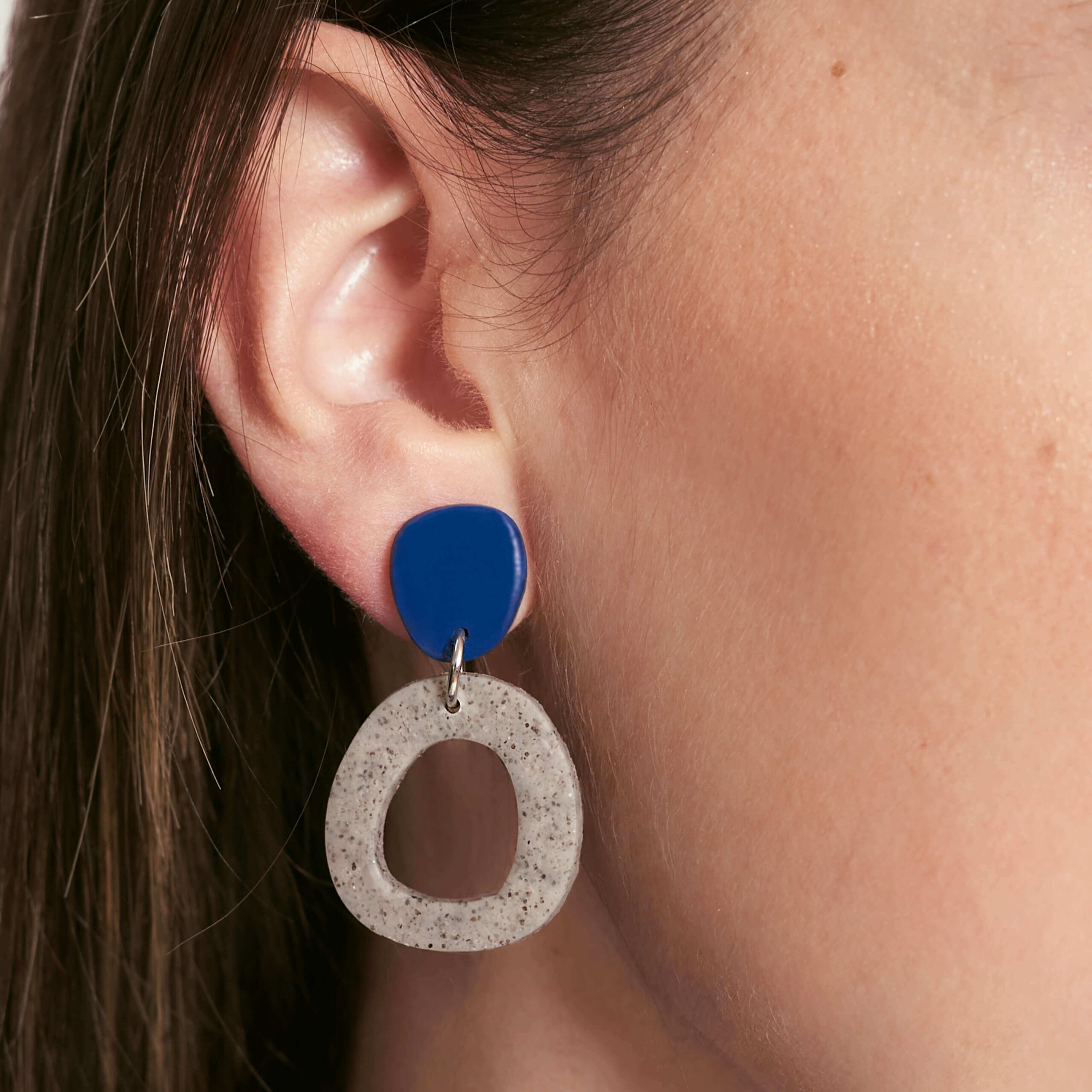 Hecho a mano en arcilla polimérica gris piedra, con un toque de brillo en la parte superior de color azul marino.