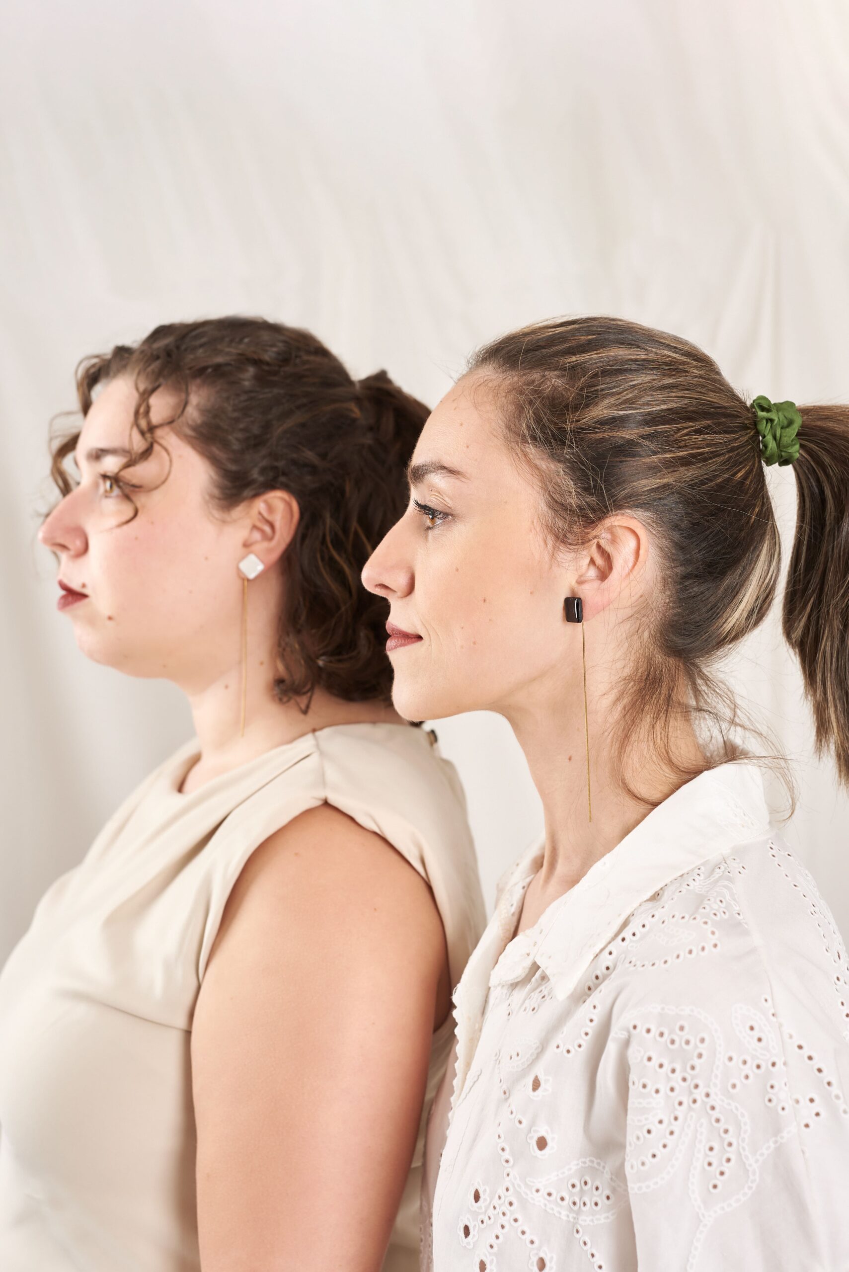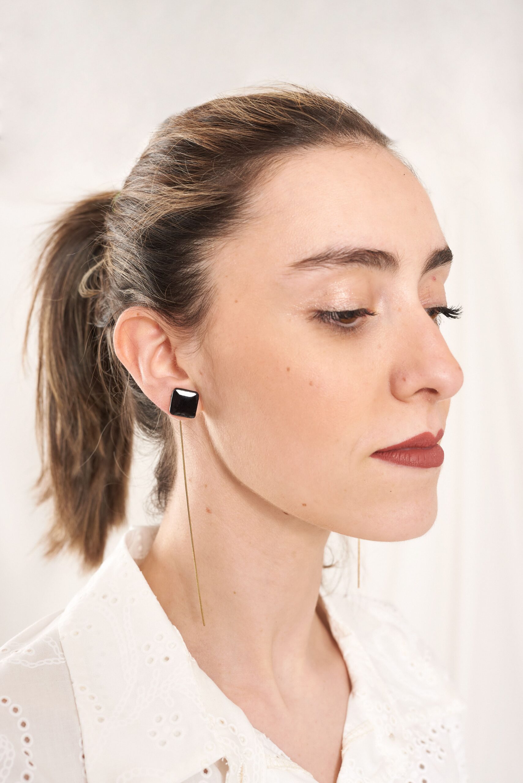 Pendientes en formato rombo hechos a mano en arcilla polimérica en negro mate o nácar, llevan por encima un brillo para hacerlos más especiales. Es un pendiente que incluye una tuerca larga en acero inoxidable que es lo que le da la largura. Se puede llevar con una tuerca normal quedando sólo la parte cuadrada puesta. Se puede llevar indistintamente, un 2×1, según la ocasión.