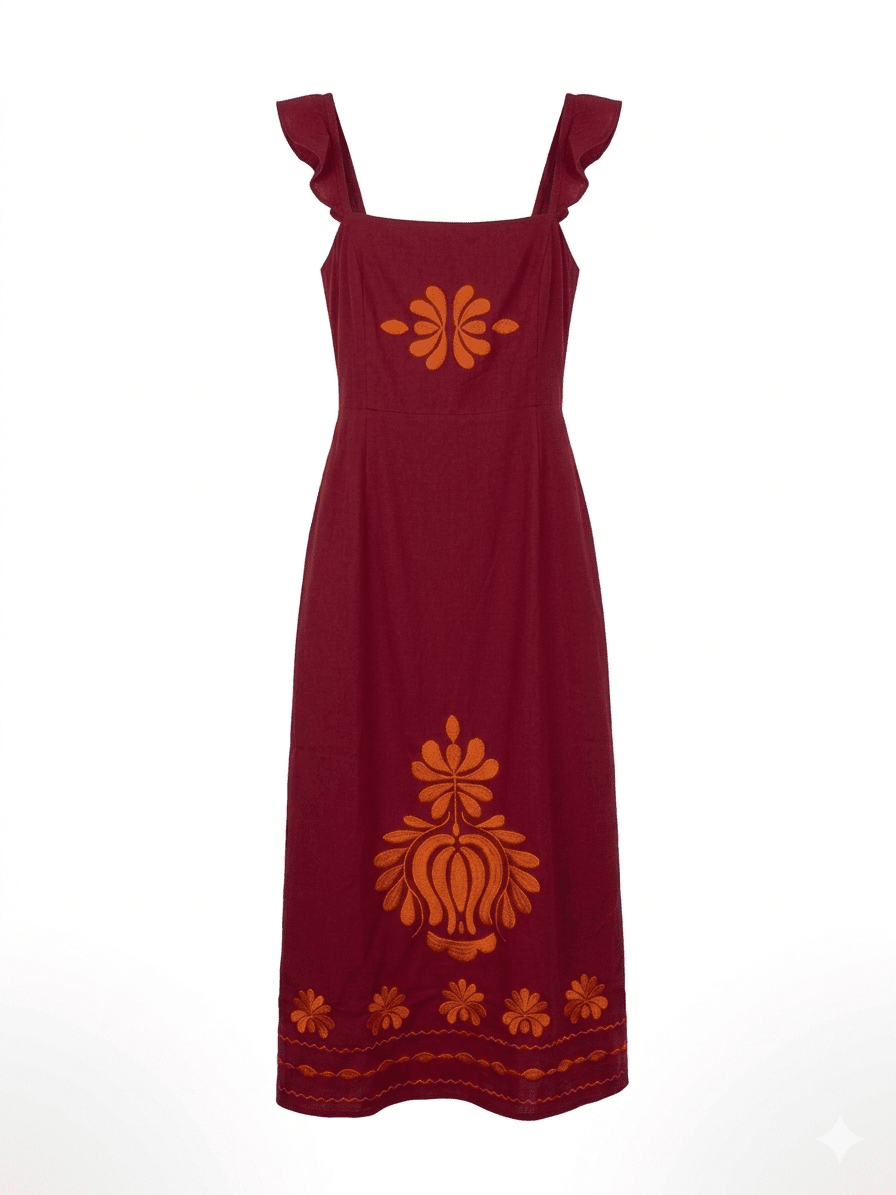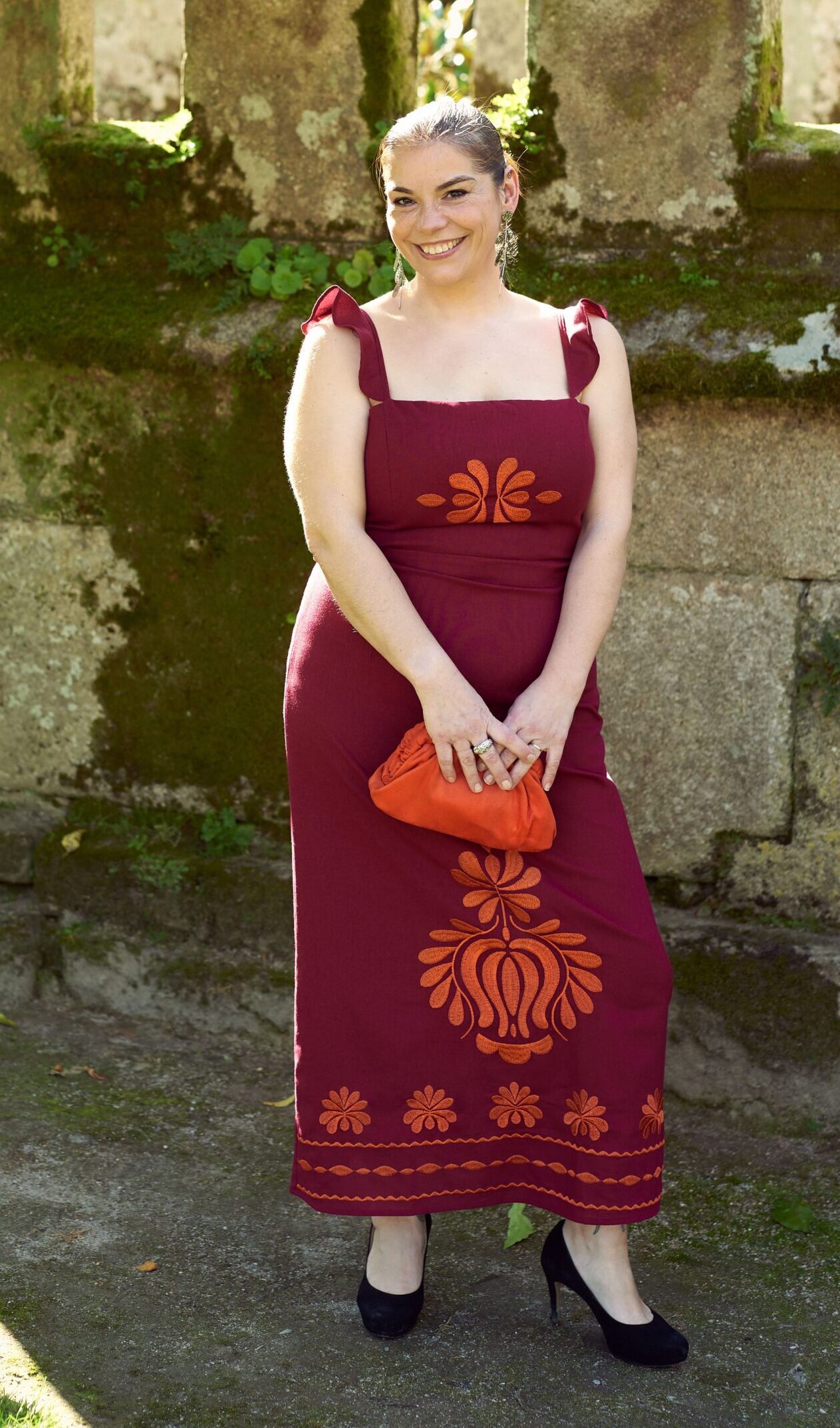Vestido en color burdeos, edición limitada con bordados en tonos naranja