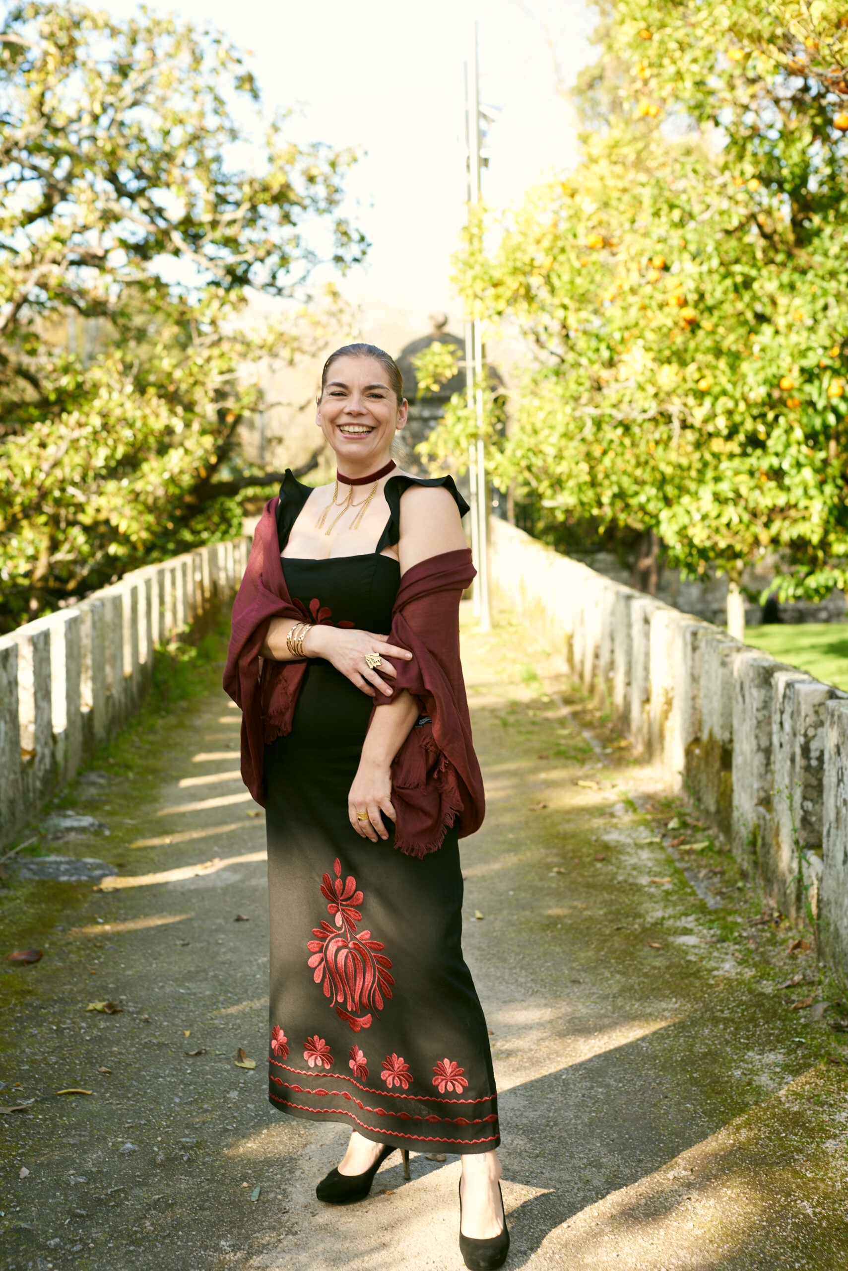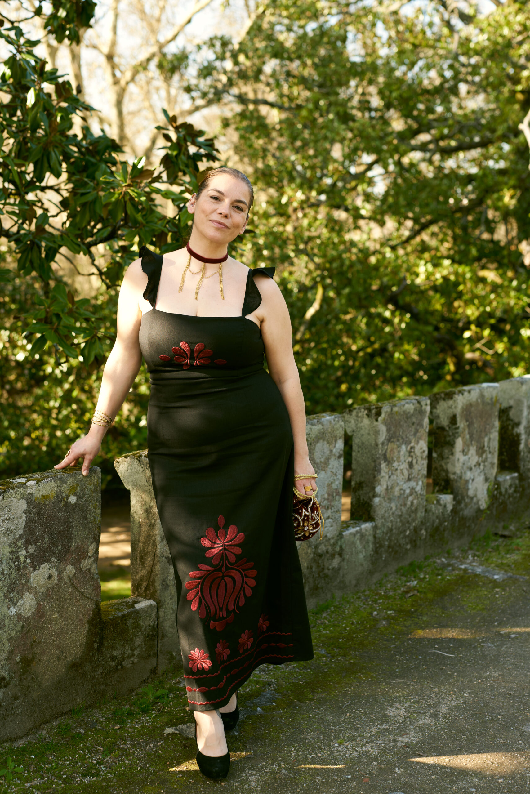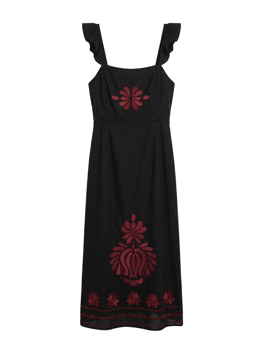 Vestido en color negro, edición limitada con bordados en tonos burdeos.